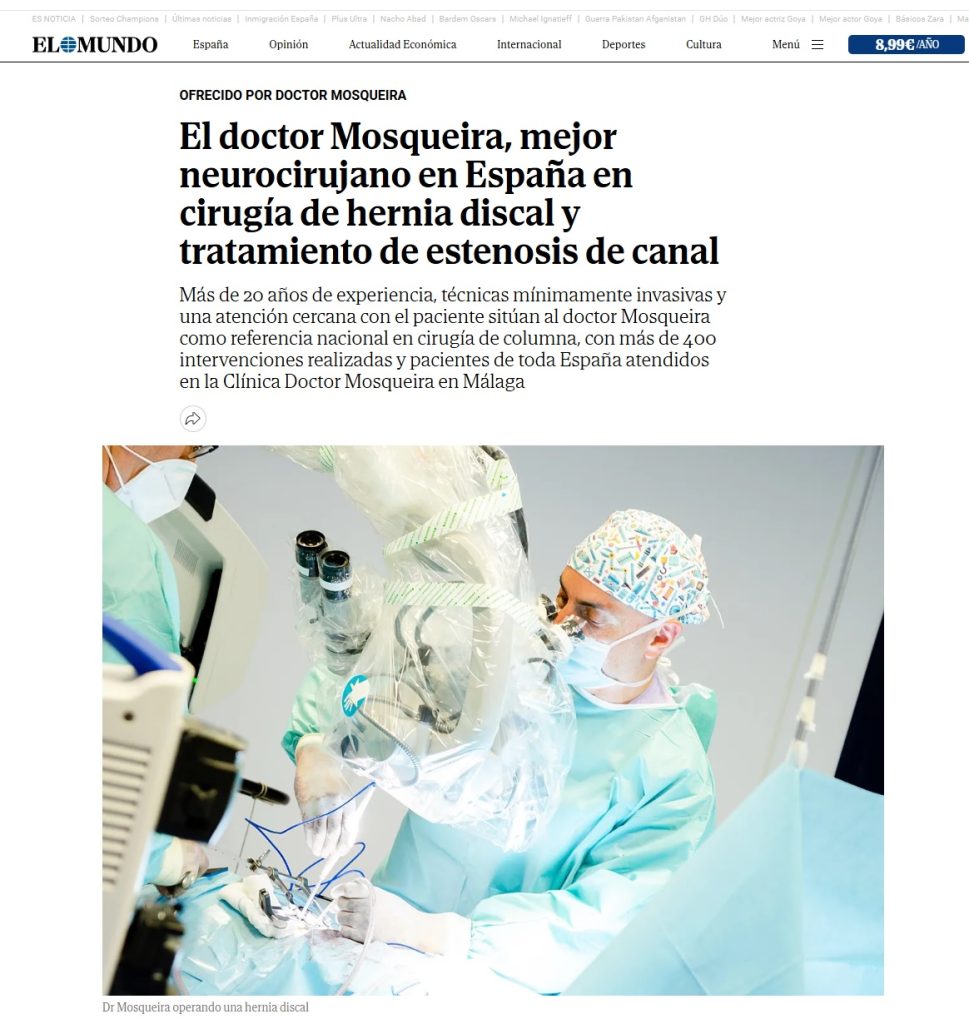 Varios medios españoles se han hecho eco del Dr. Bernardo Mosqueira como referente en intervenciones de herniad discal y estenosis de canal mediante microcirugía mínimamente invasiva.